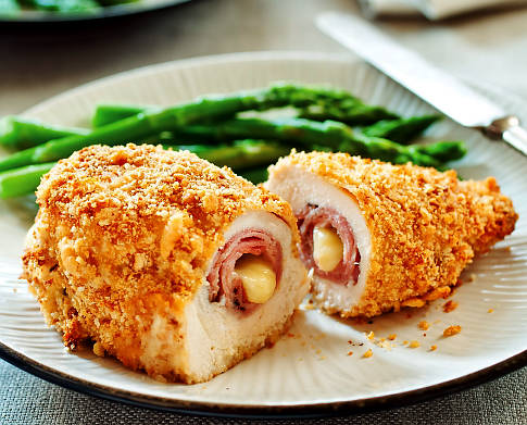 Вам понадобится свиная или говяжья мякоть (вес не имеет значения, всё зависит от вашего терпения и от количества человек, на которое вы готовите кушать ), либо просто куриное или индюшиное филе. Нарезаем тонкими пластами, отбиваем. Солим-перчим. Сгибаем отбитый кусок пополам, формируя конвертик. Вовнутрь конвертика запихиваем сыр и ветчину, после чего края нашей такого себе вареничка скрепляем зубочистками. Обваливаем в тройной панировке: в сухарях, яйце и снова в сухарях, жарим в большом количестве масла на среднем огне под крышкой. Перед подачей подсушите на бумажном полотенце, чтоб убрать излишки масла. Подавать, с чем хотите. Мои друзья обычно без ничего их топчут :)