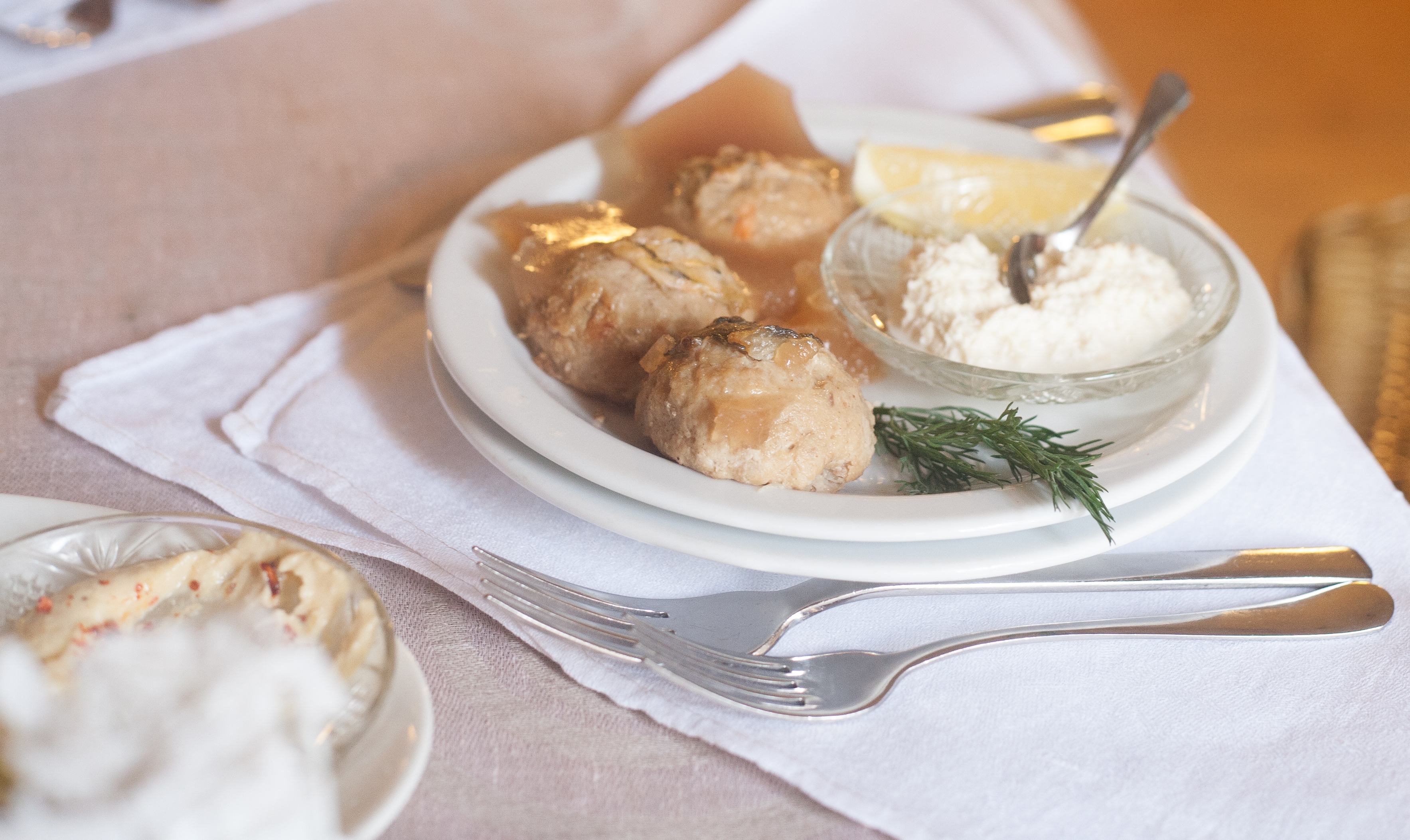 Начну с гефилте фиш. Традиционно так называется фаршированная рыба. Знаете, как на праздники подают – целую такую рыбину, в которой внутри вместо филе спрессованный фарш? Так вот, “розмариновые” повара изловчились и слепили из этой самой рыбы котлеты. Подавали их нам в холодном виде с лимоном и хреном, и я должна вам признаться, что это было ОХРЕНИТЕЛЬНО. Не из-за наличия натёртого на мелкую тёрку хрена, нет. Котлеты эти оказались просто прекрасными на вкус: в застывшей лужице холодца в количестве трёх штук они просто растаяли в наших ртах.