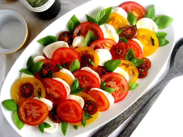 Вообще-то итальянцы делают “капрезе” с красными помидорами – так салат символизирует цвета национального флага. Но, согласитесь, с разноцветными помидорами салат выглядит веселее? :)
