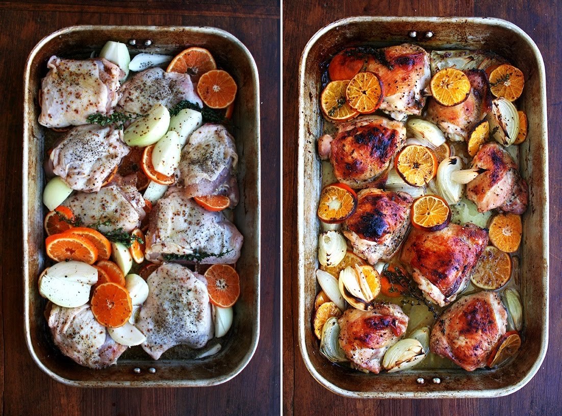 Что делать, если дома есть лишь кура и одна апельсинка, а выходить в магазин лень? Правильно! Приготовить курицу с апельсинами! Тем более, что цитрусы хорошо сочетаются с мясом. И тем более, что готовить тут ничего и не надо: всё, что вам нужно – это порезать апельсин и лук и натереть курицу специями. Дальше за вас всё сделает духовка.
