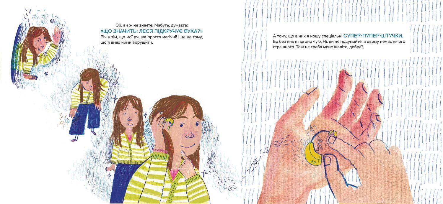 Це надважлива книжка для мене. Ця книжка про мене. Бо Леся насправді — це я. Це я люблю булки. Це я люблю смішити людей. Це я вмію ворушити вухами і стояти на голові. І це я маю супер-пупер штучки у моїх вухах — суперсилу, що дозволяє мені вимикати світ навколо себе одним дотиком.